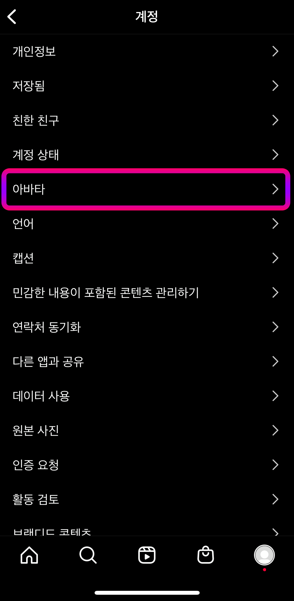 3. 계정 탭 내에 있는 '아바타'를 클릭합니다.