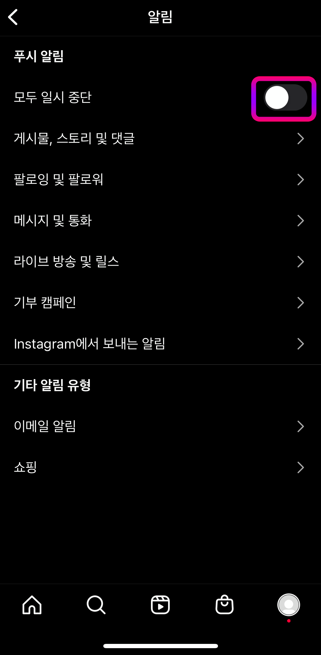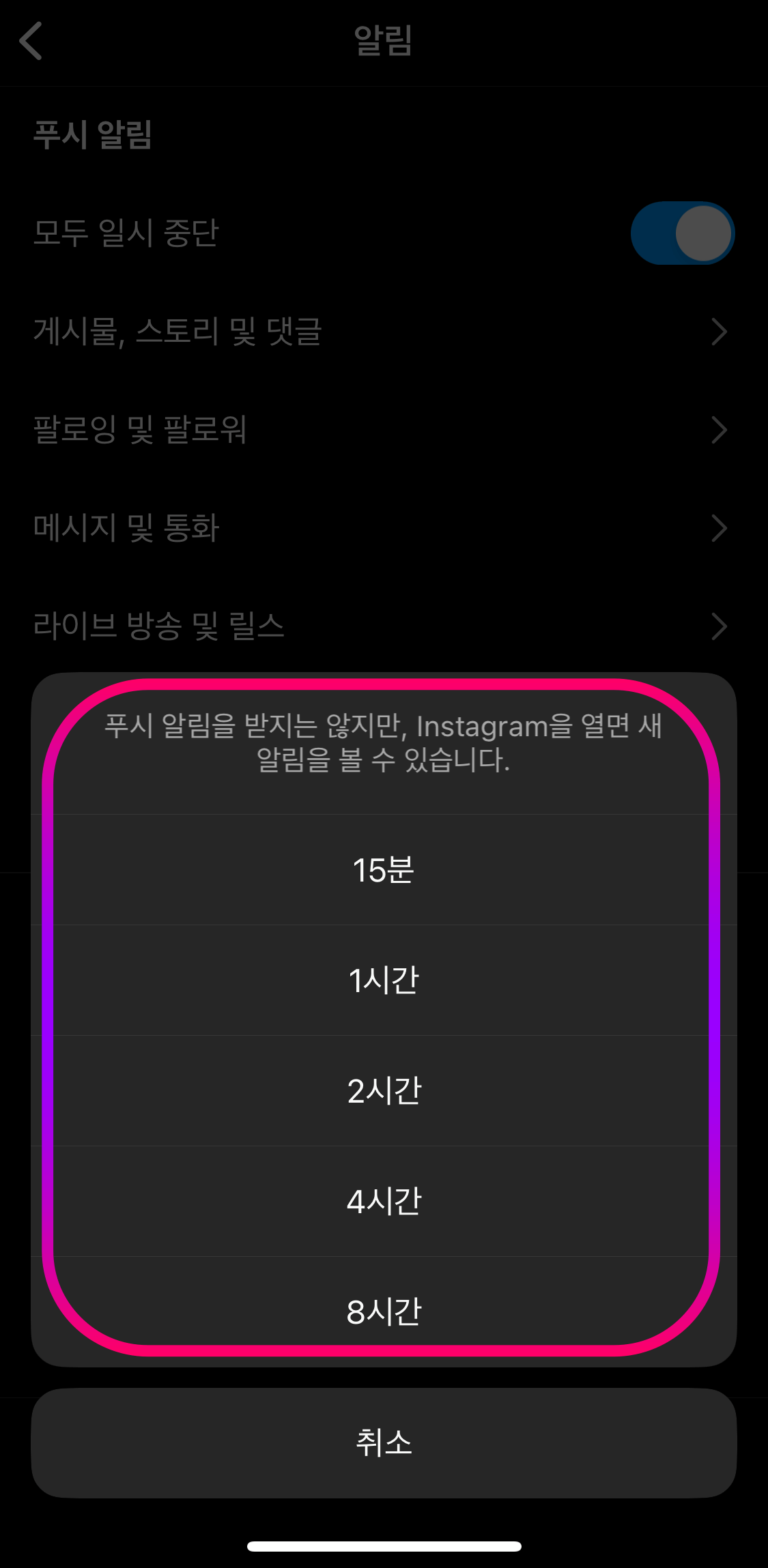 인스타그램 푸시 알림 일시 중단하는 방법은?